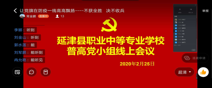 (二)通过视频连线的方式开展主题党日活动,各党小组也分别召开视频会议,认真学习各级教育系统加强党的领导坚决打赢疫情防控总体战的文件精神,结合工作实际,学校党支部要求全校党员干部带头发扬 “特别能吃苦、特别能战斗、特别能奉献”的防疫精神,冲锋在前、攻坚克难、凝聚人心、鼓舞斗志,让党旗在防控疫情斗争第一线始终高高飘扬。