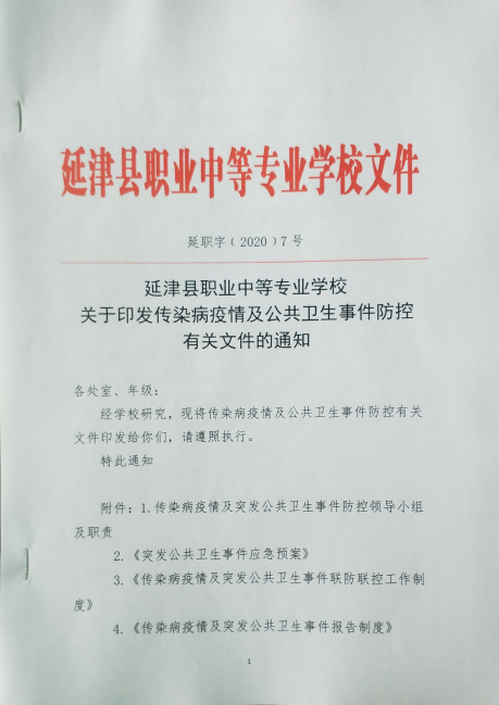 从1月29日起,学校陆续出台了《关于成立新型冠状病毒感染的肺炎疫情防控工作领导小组的通知》、《新型冠状病毒感染的肺炎疫情防控Ⅰ级应急响应工作预案》、《关于新型冠状病毒感染的肺炎疫情防控期间网上教育教学工作方案》、《关于做好新型冠状病毒感染的肺炎疫情防控工作方案》、《新型冠状病毒感染肺炎疫情信息定期报告制度》、《关于印发传染病疫情及公共卫生事件防控有关文件的通知》、《2020学年春季开学准备工作方案》、《2020年春季开学工作方案》等文件,为疫情防控工作提供了制度保障。