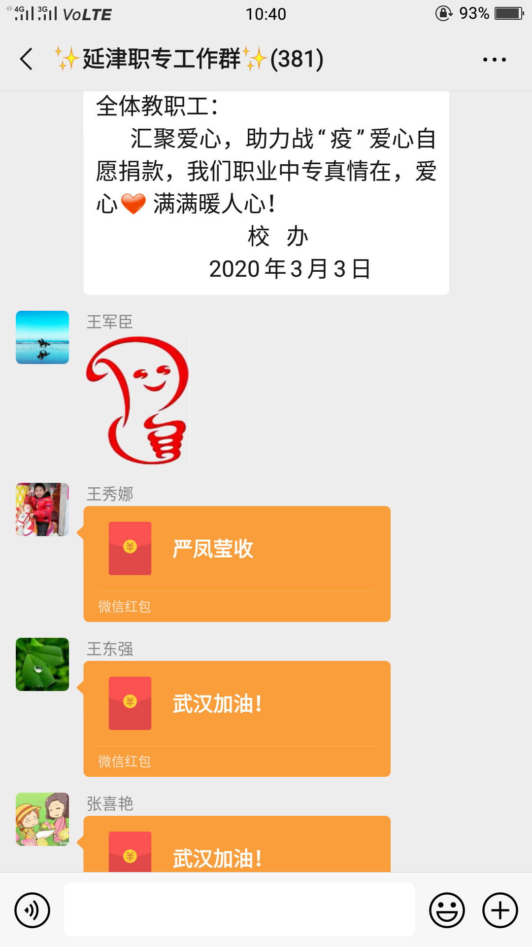在决战疫情的关键时期,在县委组织部的倡议下,学校党支部发出了“汇聚爱心,助力战役”的号召 ,3月2日上午,仅仅两个多小时,通过现场捐款、微信捐款等形式捐款就达6000元,截止到3月3日上午10:30,捐款达15300余元。