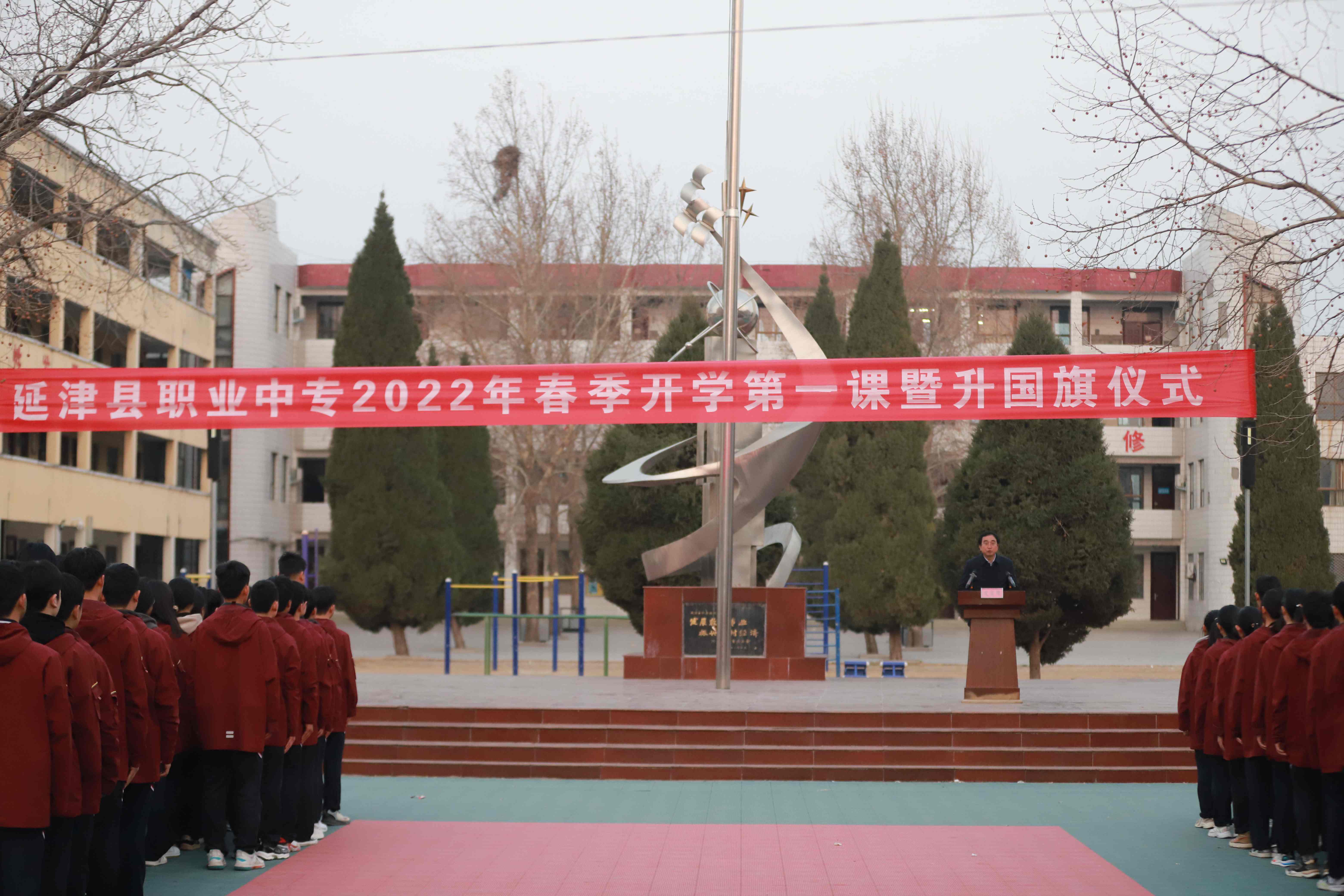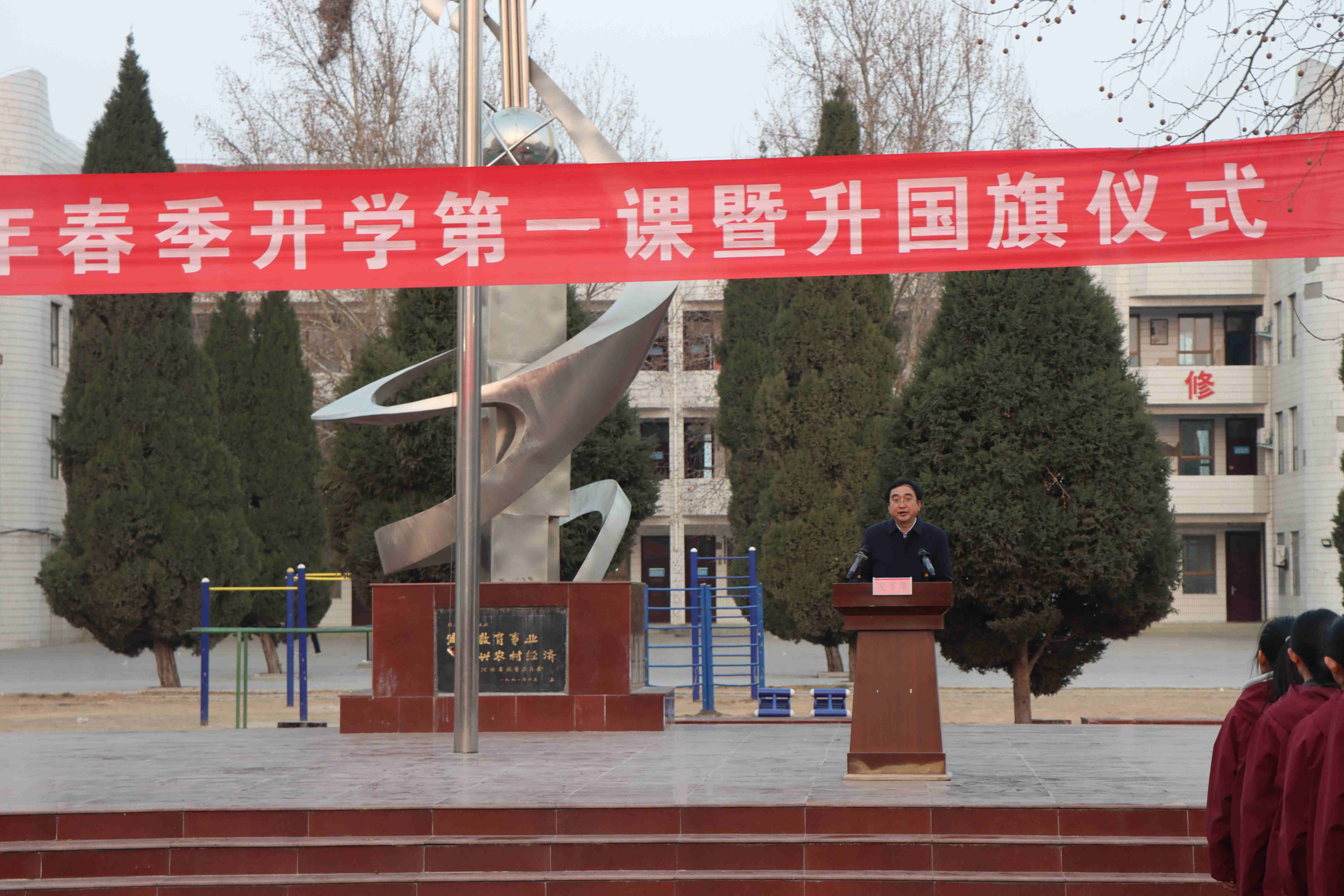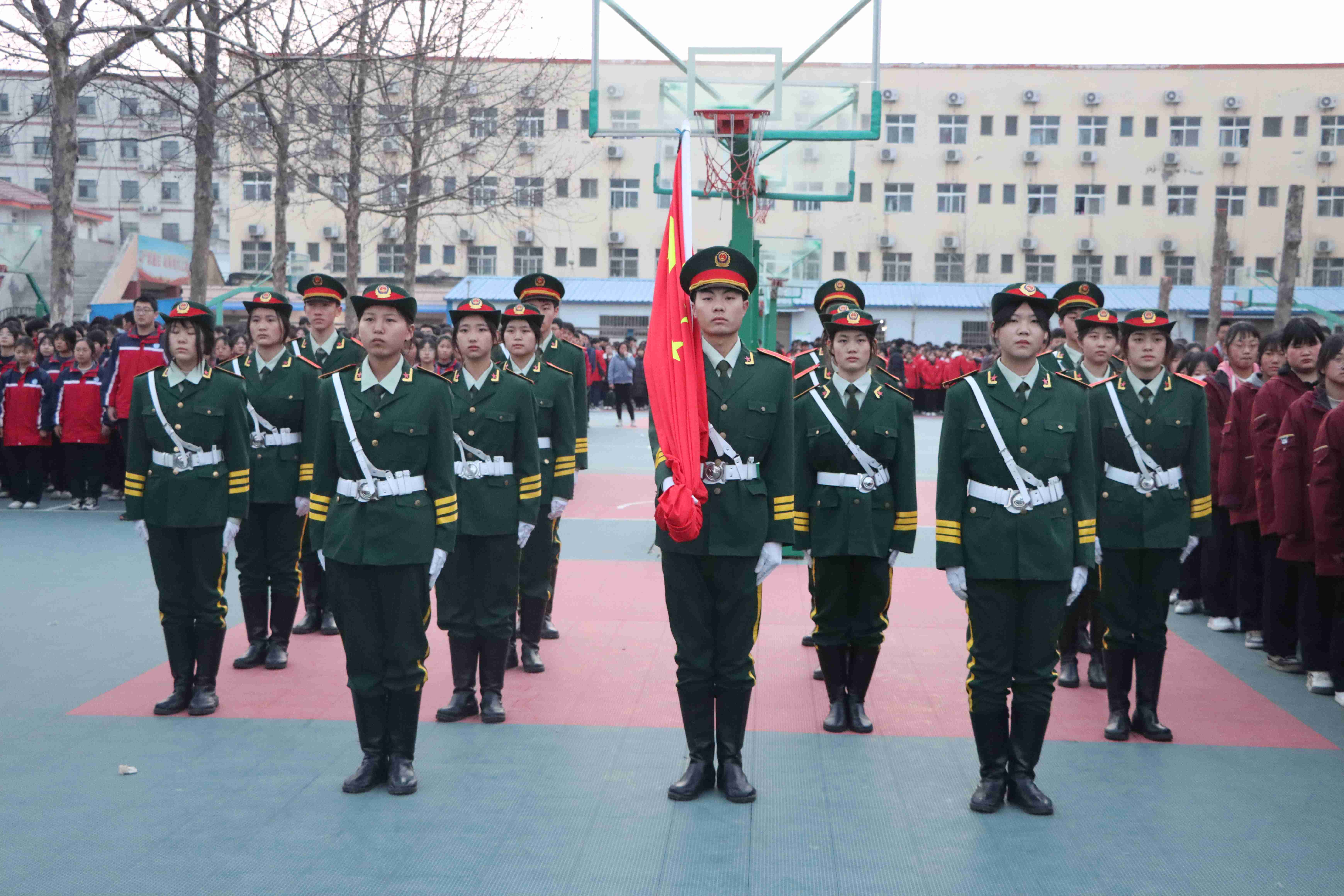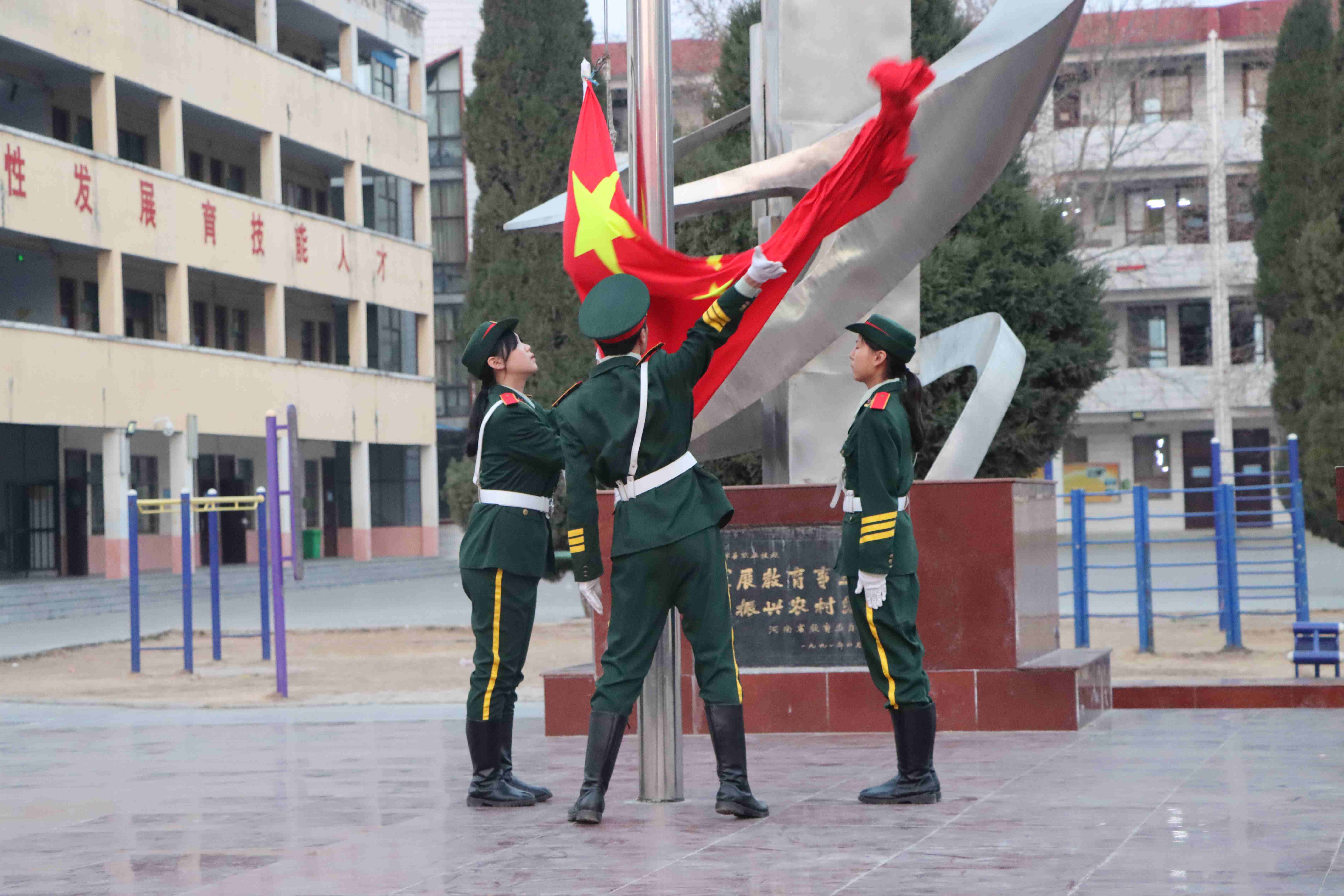 迎着初春的晨曦,鲜艳的五星红旗在校国旗护卫队的护送下,伴着雄壮的义勇军进行曲冉冉升起。全体师生肃立注目,满怀信心和对未来的憧憬,朝气蓬勃地投入到新学期的学习、工作和生活中。