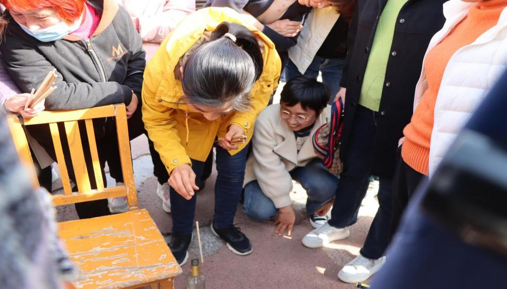“丢筷子“计数单人赛,专注精神的体现。有高度要技术,凝心聚神身站稳,自由落体瓶口进。