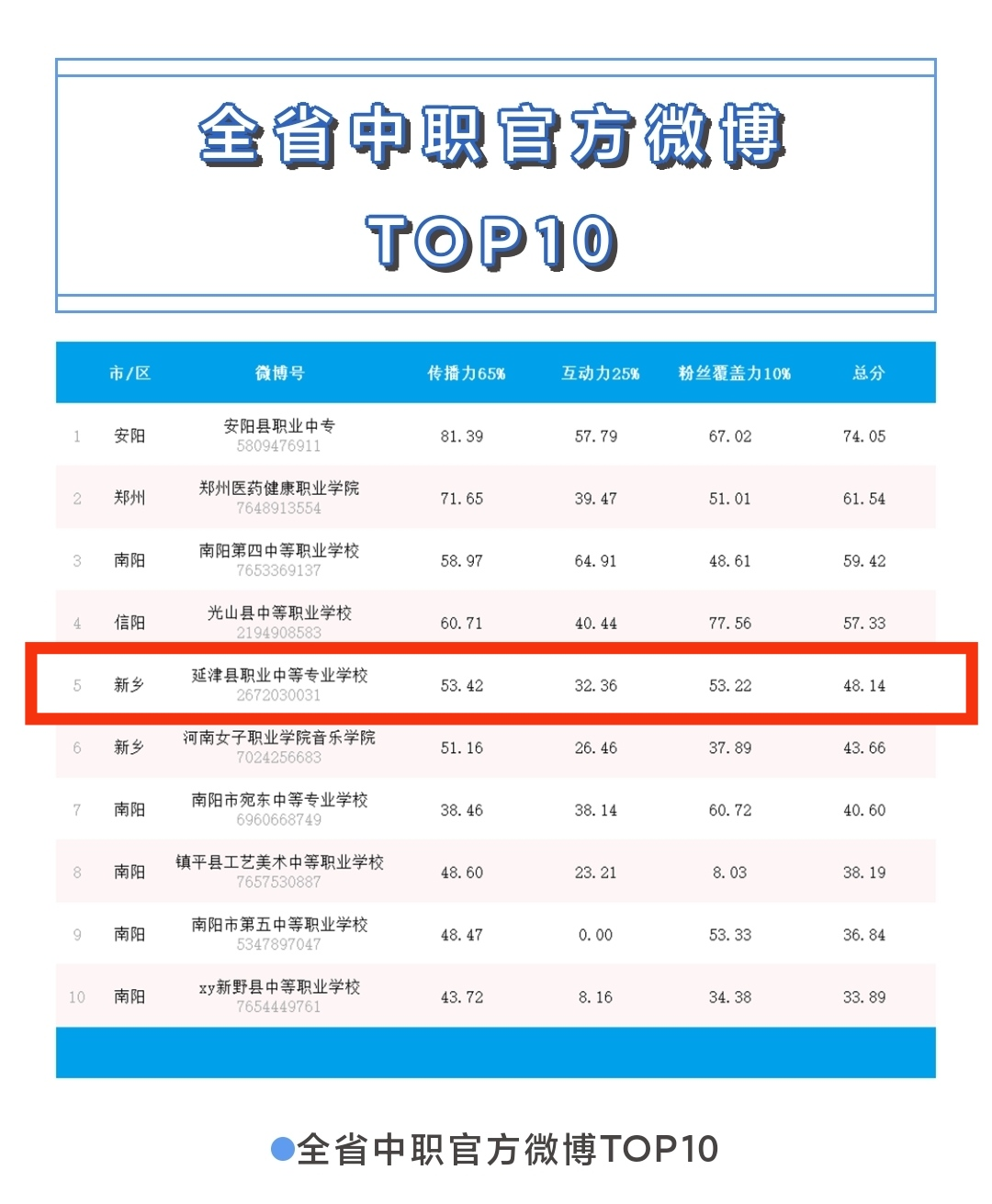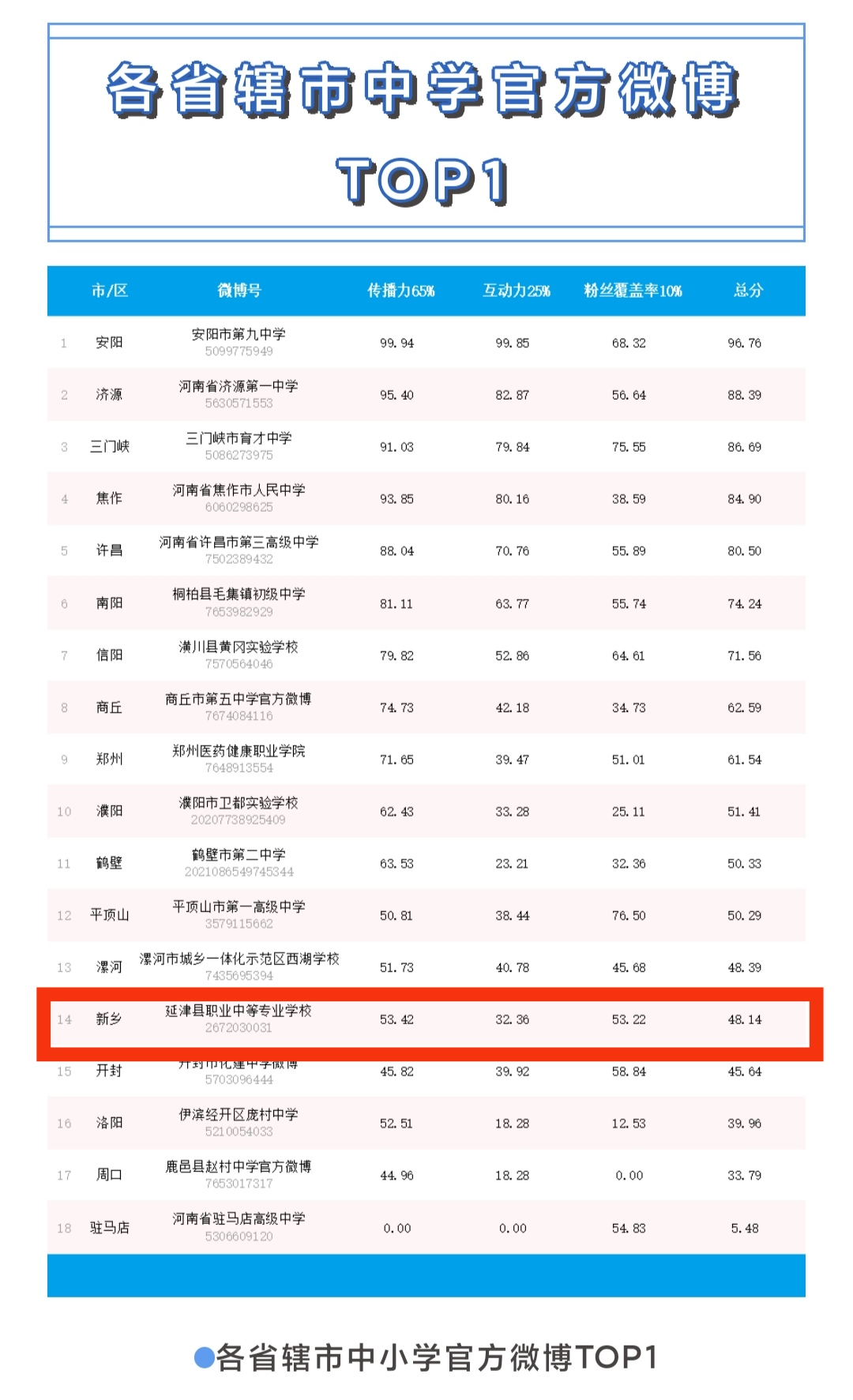 近日,河南省教育新媒体暨舆媒研究中心发布了“河南省中学官方微博”传播力榜单,白菜官网荣列省辖市中学和中职类官方微博前列。中职类和中学类学校官方微博传播力排名中,白菜官网在新乡市排名都是第一名,在全省排名中,中职类官方微博传播力排名第六。