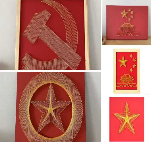 学生制作的手工艺品主要以党徽、天安门为内容,风格多样,每一幅都流露出作者对党、对祖国的热爱与深情,诠释了永远感党恩、听党话、跟党走的坚定信念。
