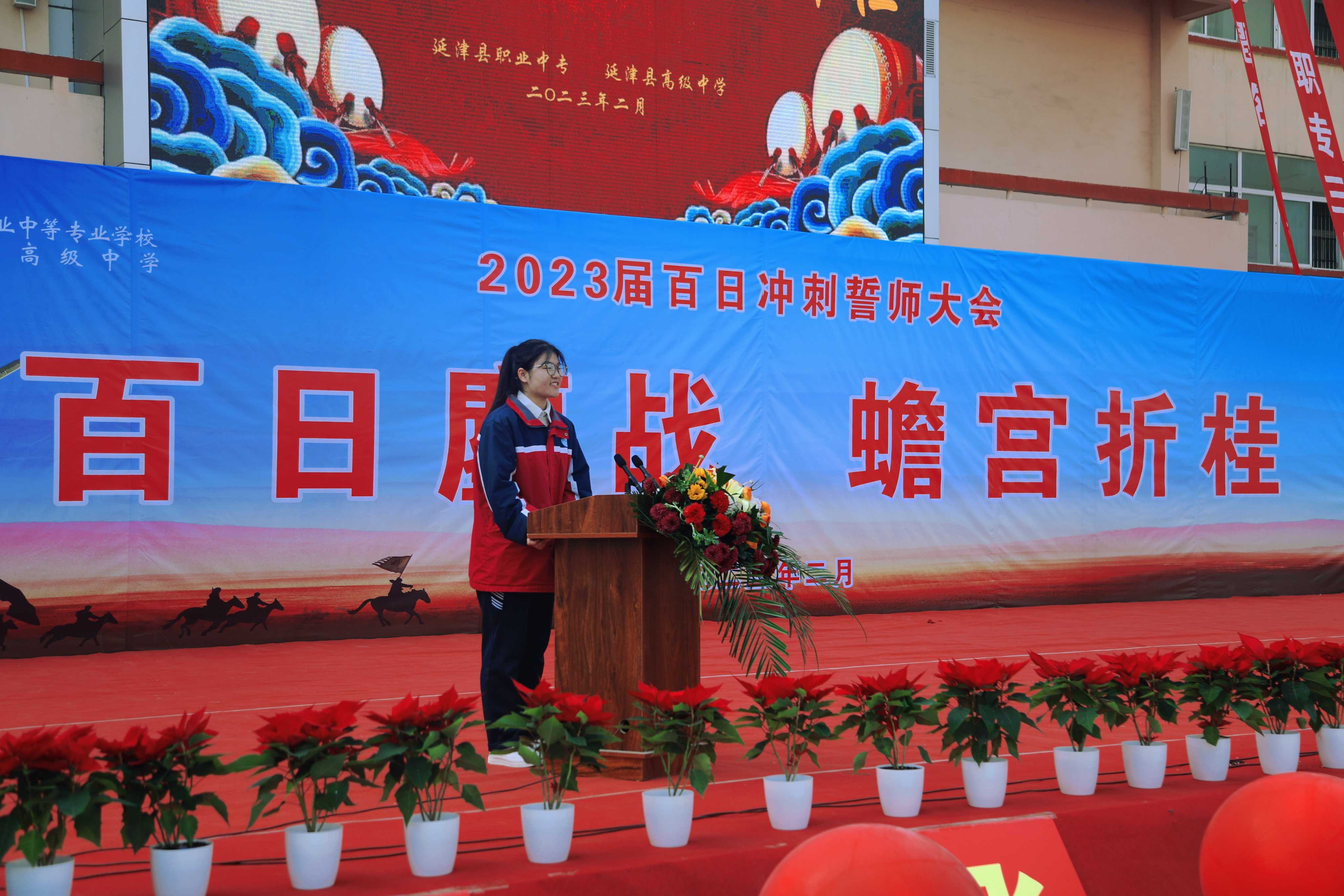 高三教师代表赵娜说,高考,是决定人生道路的分水岭,是决断青春梦想的天门关,是展现学子实力的大龙门。为了这次高考,我们历炼、准备了整整12年。12个春秋,我们流了多少汗水,花了多少精力和心思去锻铸智慧的利剑,苦炼过硬的本领,为的是高考战场上能过关斩将,势如破竹夺桂冠!冰雪消融,化作千顷碧波;朗朗书声,铺就锦绣前程。现在,离2023年决战的时刻仅剩下100天了, 这100天,是激情燃烧的100天,是顽强拼搏的100天,更是梦想成真的100天。希望同学们增强时间意识,拼搏意识,鏖战百日,铸我辉煌!